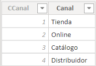 - Canal: Es una tabla donde cada fila representa un Canal de venta: el canal Tienda, el canal Online, etc. Es una tabla muy sencilla y se ve que realmente sirve para «traducir» un código de canal (e.g. el canal 1 de la primera fila de la tabla ventas) en un nombre de canal («Tienda»). Viene a ser una especie de maestro de códigos de canal. Si tienes un código de canal y quieres averiguar su nombre, solo vas al maestro de códigos y sabrás el resultado. Valga decir que a este tipo de tablas maestras o maestros de código, se les denomina también tablas de dimensión. Yo prefiero llamarlas Maestros de Código.