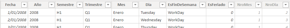 - Fecha: Es un Maestro de Fechas. Si bien puede sonar raro, solo sigamos los que hemos aprendido de lo que es una tabla maestra de códigos: cada línea representa una fecha. En la primera fila está la fecha con «código» 1/01/2008, y gracias a las demás columnas, sabemos que esa fecha pertenece al año 2008, al semestre H1, al trimestre Q1, al mes Enero, fue martes («Tuesday»), etc. Vemos pues que, al tener este extraño «Maestro de Fechas», logramos un análisis poderoso respecto de las mismas, ahora podríamos analizar por Mes, o por día de la semana, etc. Un analista de datos que usa Excel, normalmente no usa un maestro de fechas pero acabamos de descubrir que es muy útil para un análisis de tiempo poderoso. ¿Qué pasaría si -por ejemplo- en mi empresa no analizan las ventas por mes ni por trimestre sino por número de semana o por número de campaña pues el año se divide en 18 campañas? Bueno, lo único que habría que hacer para habilitar un análisis como el que la pregunta plantea, es agregar una columna «número de semana» o «número de campaña» al maestro de fechas y listo. Ya se podría analizar las ventas vía esos rubros.