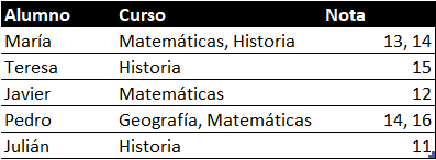 Esta tabla a la que llamo «pésima tabla» no sirve para analizar. Es un excelente ejemplo de un muy mal diseño. Si bien la información que contiene es la misma que la de la tabla anterior, el modelado está mal hecho. El primer registro tiene «DOS datos» en la columna Curso (i.e. consigna dos nombres de curso donde solo debería aparecer uno: «Matemáticas» e «Historia»). Lo mismo sucede en la columna «Nota». Hay dos notas en algunos registros. Esto causará, por ejemplo, que la columna «Nota» no pueda ser tipo número (sino tipo texto) y, por ello, no podría calcularse la nota promedio, por ejemplo. Qué sucedería, además, si en lugar de 2 cursos, se ponen 3, o 5, o 10 en una sola fila. Se vuelve inmanejable.