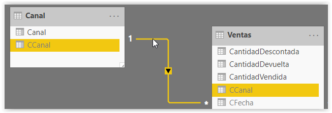 Para terminar, además de tablas, hay relaciones (representadas por líneas en el Modelo de Datos) que no hacen más que «vincular» dos columnas que contienen el mismo código. En el gráfico que sigue se relaciona la columna CCanal de la tabla Ventas con la columna CCanal de la tabla Canal. Ambos contienen el código de Canal. Una manera de leer esto sería: para saber qué significa un código de canal (columna CCanal) en la tabla Ventas, hay que buscarlo en la tabla Canal (columna CCanal). Los nombres de las dos columnas no tienen que ser iguales. Aquí es así por motivos pedagógicos. Pero, eso sí, deben contener los mismos datos: códigos en ambos casos.